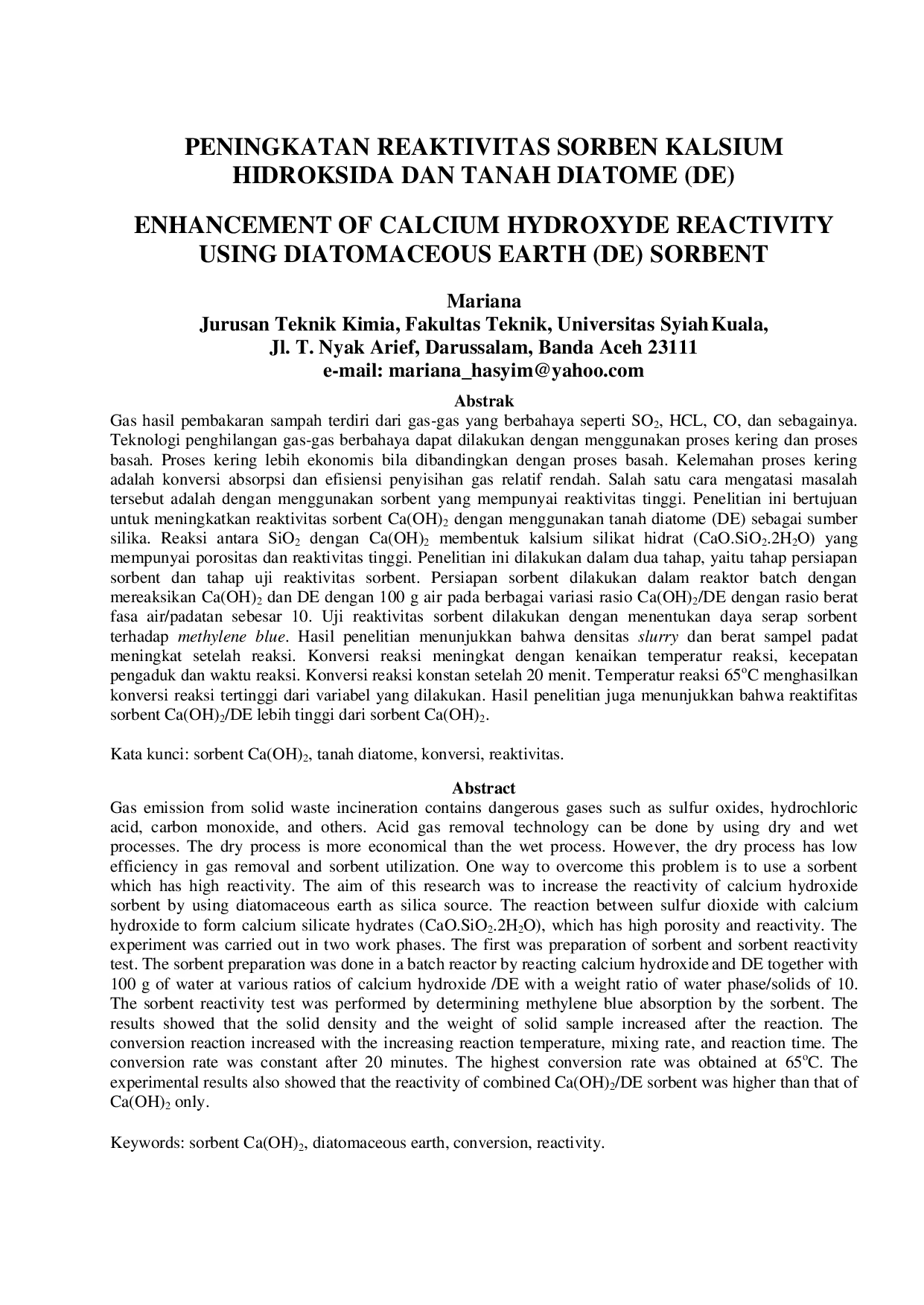 PURIFIKASIPURIFIKASI Hasil penelitian juga menunjukkan bahwa reaktifitas sorbent Ca(OH)2/DE lebih tinggi dari sorbent Ca(OH)2. Penelitian ini menyimpulkan bahwa temperatur,Hasil penelitian juga menunjukkan bahwa reaktifitas sorbent Ca(OH)2/DE lebih tinggi dari sorbent Ca(OH)2. Penelitian ini menyimpulkan bahwa temperatur,