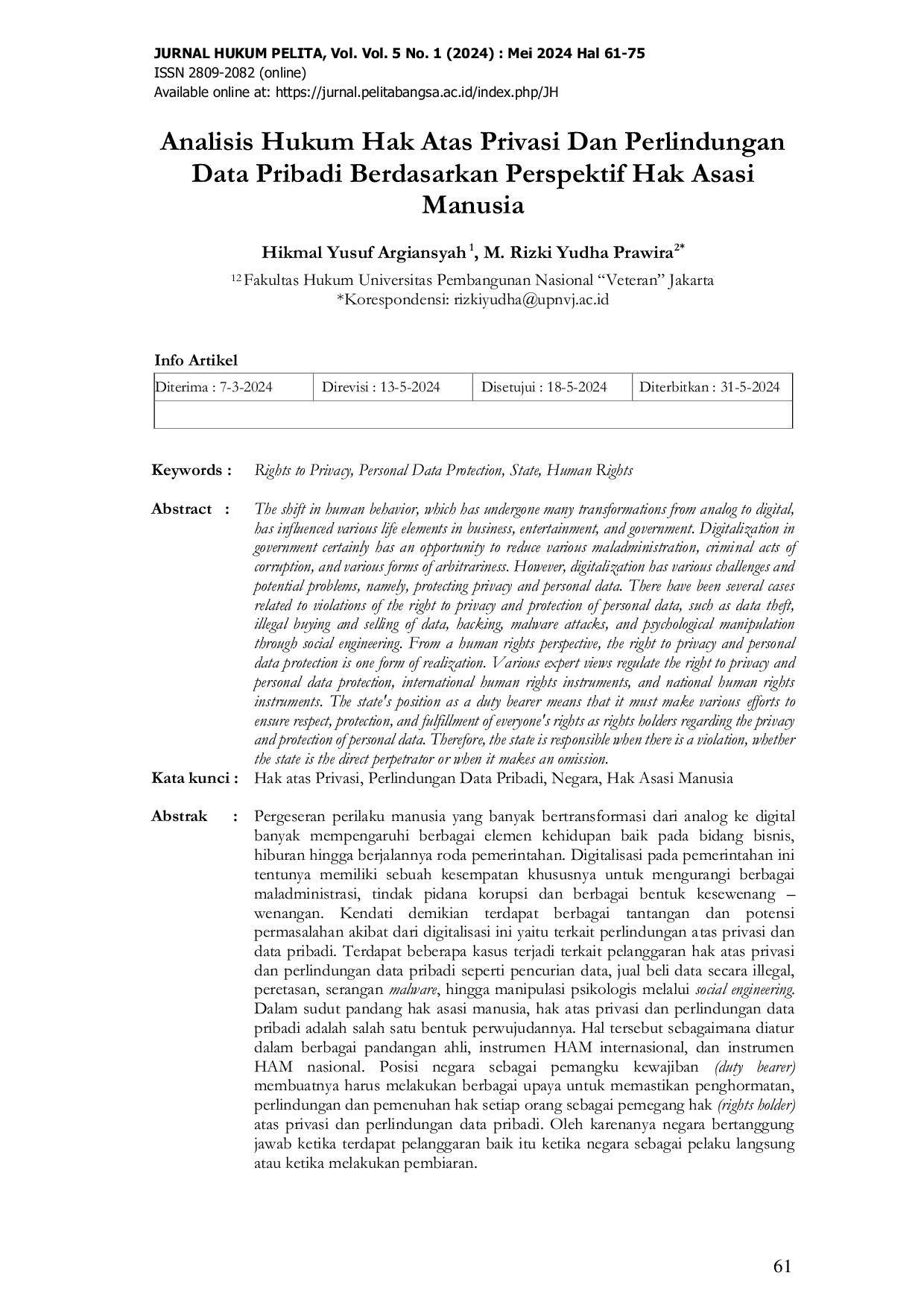 PELITABANGSAPELITABANGSA Hak atas privasi dan perlindungan data pribadi merupakan hak asasi manusia yang diakui secara internasional dan nasional. Implementasi perlindungan hakHak atas privasi dan perlindungan data pribadi merupakan hak asasi manusia yang diakui secara internasional dan nasional. Implementasi perlindungan hak