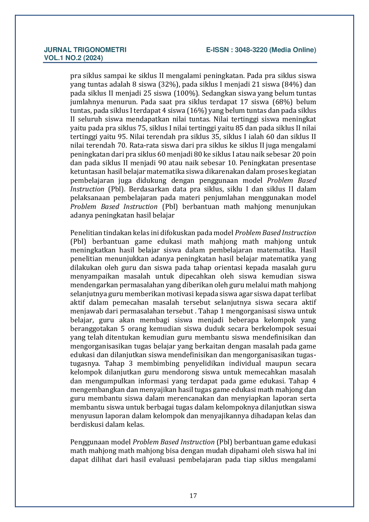 UNUHAUNUHA Penelitian ini menyimpulkan bahwa penggunaan model Problem Based Instruction (PBI) berbantu game edukasi math mahjong dapat meningkatkan hasil belajarPenelitian ini menyimpulkan bahwa penggunaan model Problem Based Instruction (PBI) berbantu game edukasi math mahjong dapat meningkatkan hasil belajar