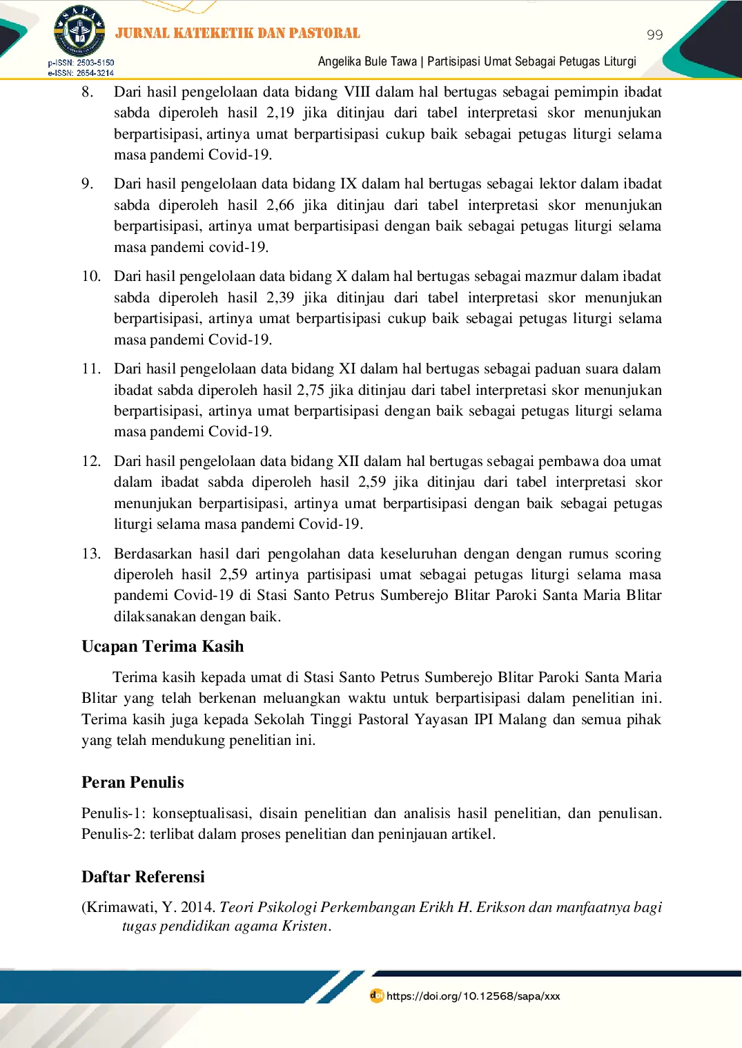 STP IPISTP IPI Penelitian ini bertujuan mengetahui partisipasi umat sebagai petugas liturgi di Stasi Santo Petrus Sumberejo Blitar. Metode kuantitatif digunakan denganPenelitian ini bertujuan mengetahui partisipasi umat sebagai petugas liturgi di Stasi Santo Petrus Sumberejo Blitar. Metode kuantitatif digunakan dengan