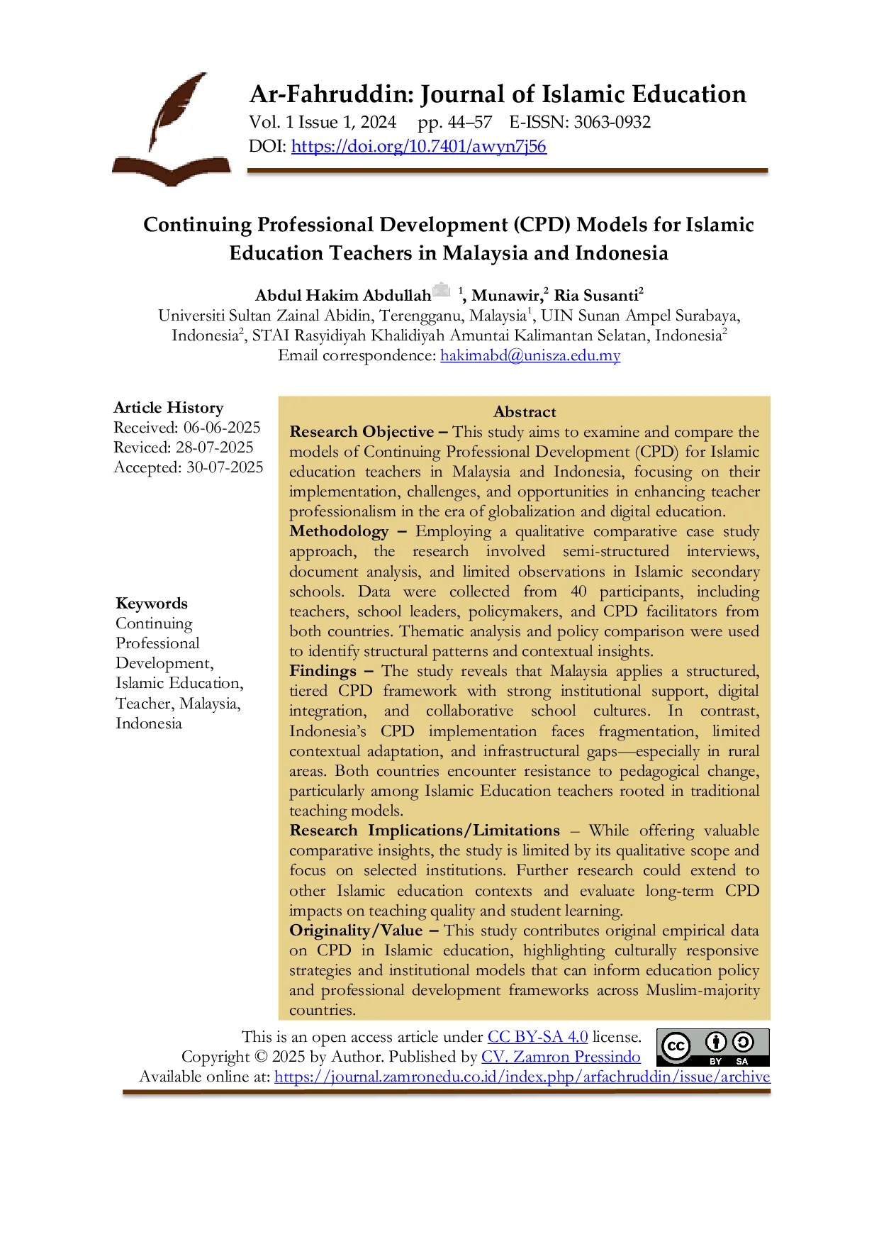 ZAMRONEDUZAMRONEDU Temuan menunjukkan bahwa Malaysia menerapkan kerangka kerja CPD berstruktur dengan dukungan institusional kuat, integrasi digital, dan kolaborasi. Sebaliknya,Temuan menunjukkan bahwa Malaysia menerapkan kerangka kerja CPD berstruktur dengan dukungan institusional kuat, integrasi digital, dan kolaborasi. Sebaliknya,