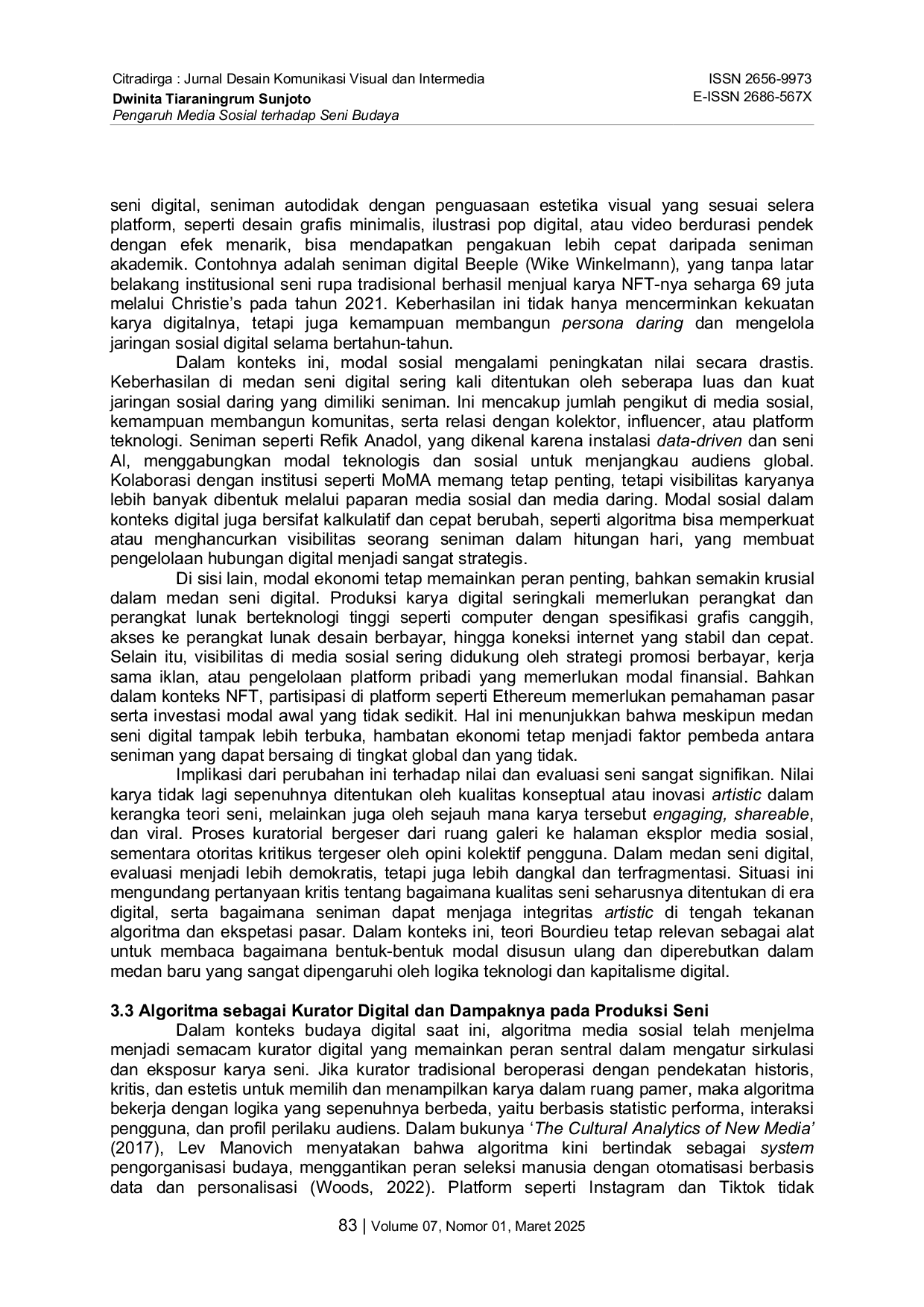 MACHUNGMACHUNG Artikel ini mengkaji bagaimana media sosial berperan untuk membentuk produksi, distribusi, dan apresiasi seni dengan menggunakan perspektif Pierre Bourdieu,Artikel ini mengkaji bagaimana media sosial berperan untuk membentuk produksi, distribusi, dan apresiasi seni dengan menggunakan perspektif Pierre Bourdieu,