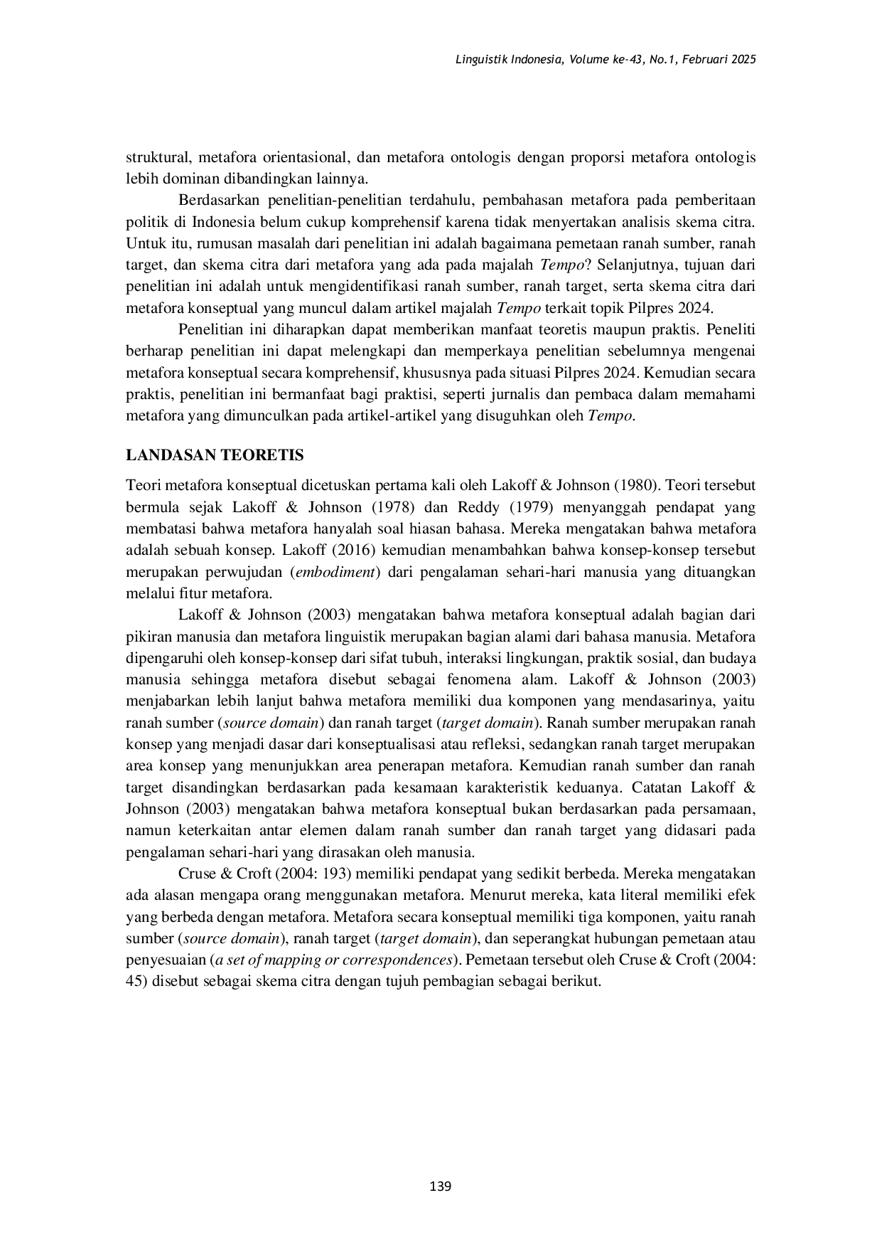 LINGUISTIK INDONESIALINGUISTIK INDONESIA Berdasarkan analisis delapan metafora, ditemukan dua jenis skema citra, yaitu IDENTITY – MATCHING dan IDENTITY – SUPERIMPOSITION.metafora-metaforaBerdasarkan analisis delapan metafora, ditemukan dua jenis skema citra, yaitu IDENTITY – MATCHING dan IDENTITY – SUPERIMPOSITION.metafora-metafora