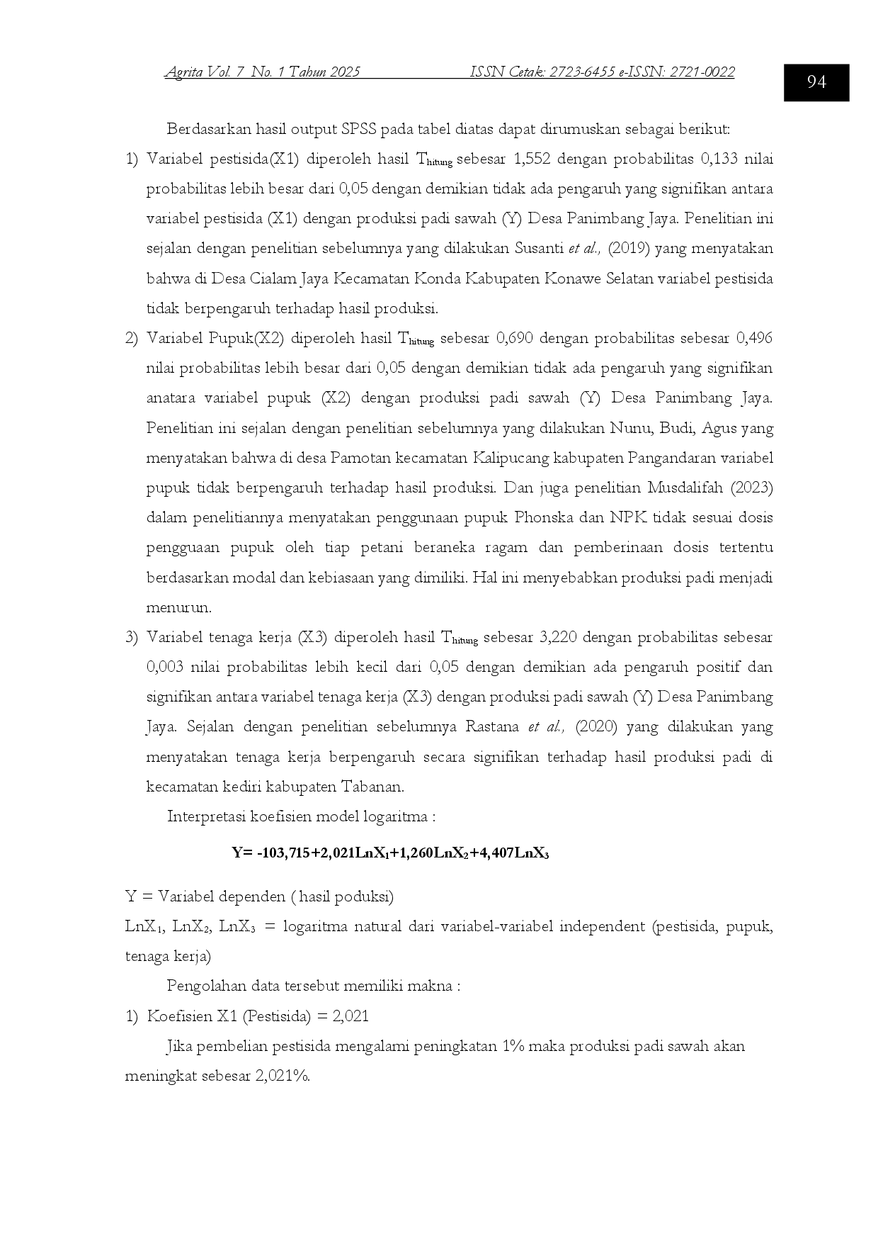 UNSURUNSUR Berdasarkan hasil analisis fungsi Cob-Douglas melalui analisis regresi berganda secara simultan, penggunaan pestisida, pupuk, dan tenaga kerja berpengaruhBerdasarkan hasil analisis fungsi Cob-Douglas melalui analisis regresi berganda secara simultan, penggunaan pestisida, pupuk, dan tenaga kerja berpengaruh