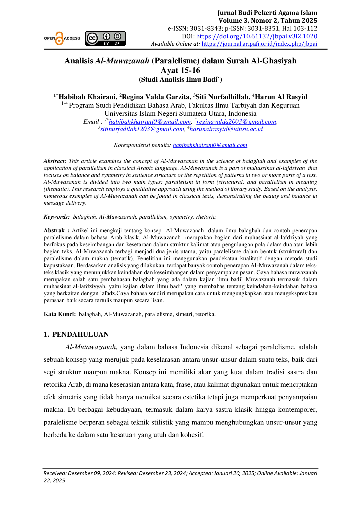 ARIPAFIARIPAFI Muwazanah termasuk dalam muhassinat al-lafdziyyah, yaitu kajian dalam ilmu badi` yang membahas tentang keindahan-keindahan bahasa yang berkaitan denganMuwazanah termasuk dalam muhassinat al-lafdziyyah, yaitu kajian dalam ilmu badi` yang membahas tentang keindahan-keindahan bahasa yang berkaitan dengan