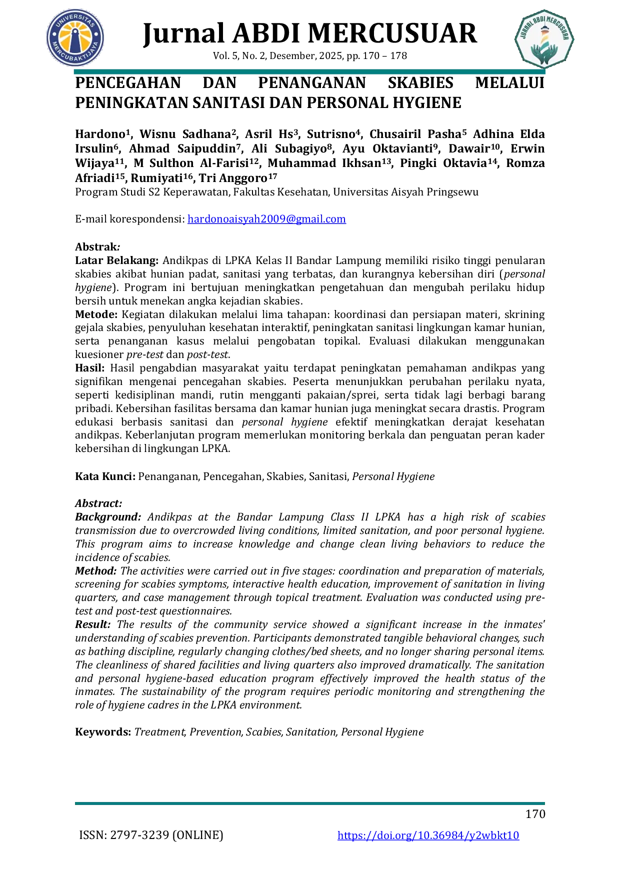 MERCUBAKTIJAYAMERCUBAKTIJAYA Kegiatan pengabdian masyarakat ini berhasil meningkatkan pengetahuan Andikpas tentang skabies dan mendorong perubahan perilaku positif dalam menjaga kebersihanKegiatan pengabdian masyarakat ini berhasil meningkatkan pengetahuan Andikpas tentang skabies dan mendorong perubahan perilaku positif dalam menjaga kebersihan