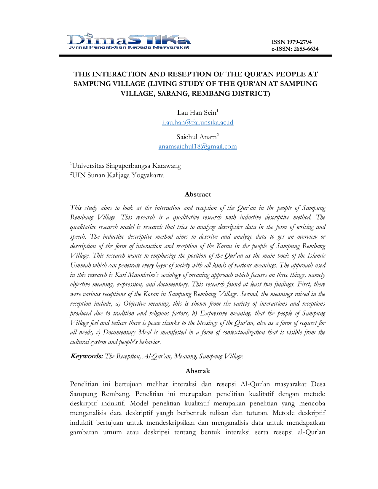 STIKKENDALSTIKKENDAL First, there were various receptions of the Koran in Sampung Rembang Village. Second, the meanings raised in the reception include, a) Objective meaning,First, there were various receptions of the Koran in Sampung Rembang Village. Second, the meanings raised in the reception include, a) Objective meaning,