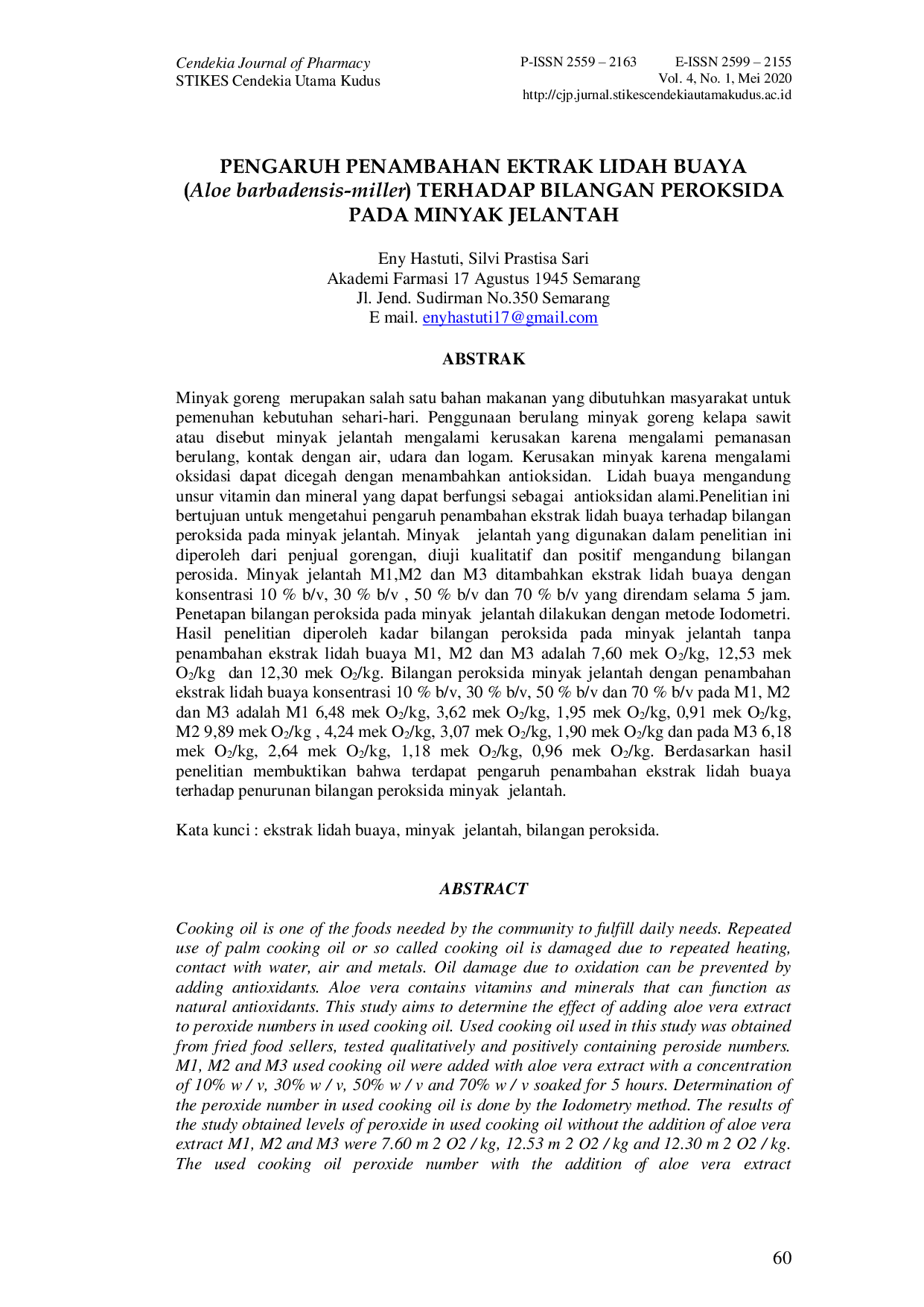 CENDEKIA UTAMA KUDUSCENDEKIA UTAMA KUDUS Penetapan bilangan peroksida pada minyak jelantah dilakukan dengan metode Iodometri. Hasil penelitian diperoleh kadar bilangan peroksida pada minyak jelantahPenetapan bilangan peroksida pada minyak jelantah dilakukan dengan metode Iodometri. Hasil penelitian diperoleh kadar bilangan peroksida pada minyak jelantah
