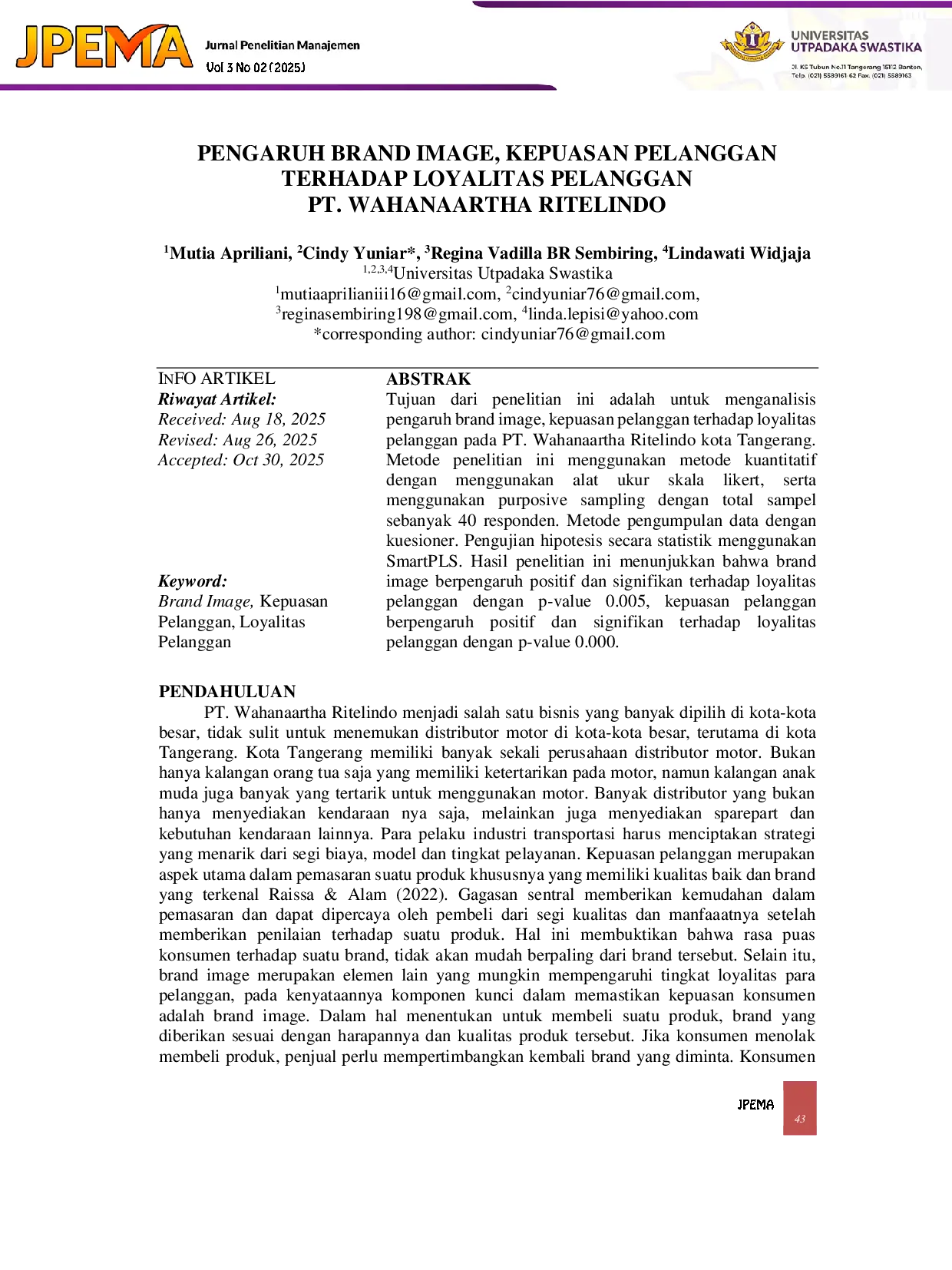 UTPASUTPAS Tujuan dari penelitian ini adalah untuk menganalisis pengaruh brand image, kepuasan pelanggan terhadap loyalitas pelanggan pada PT. Wahanaartha RitelindoTujuan dari penelitian ini adalah untuk menganalisis pengaruh brand image, kepuasan pelanggan terhadap loyalitas pelanggan pada PT. Wahanaartha Ritelindo