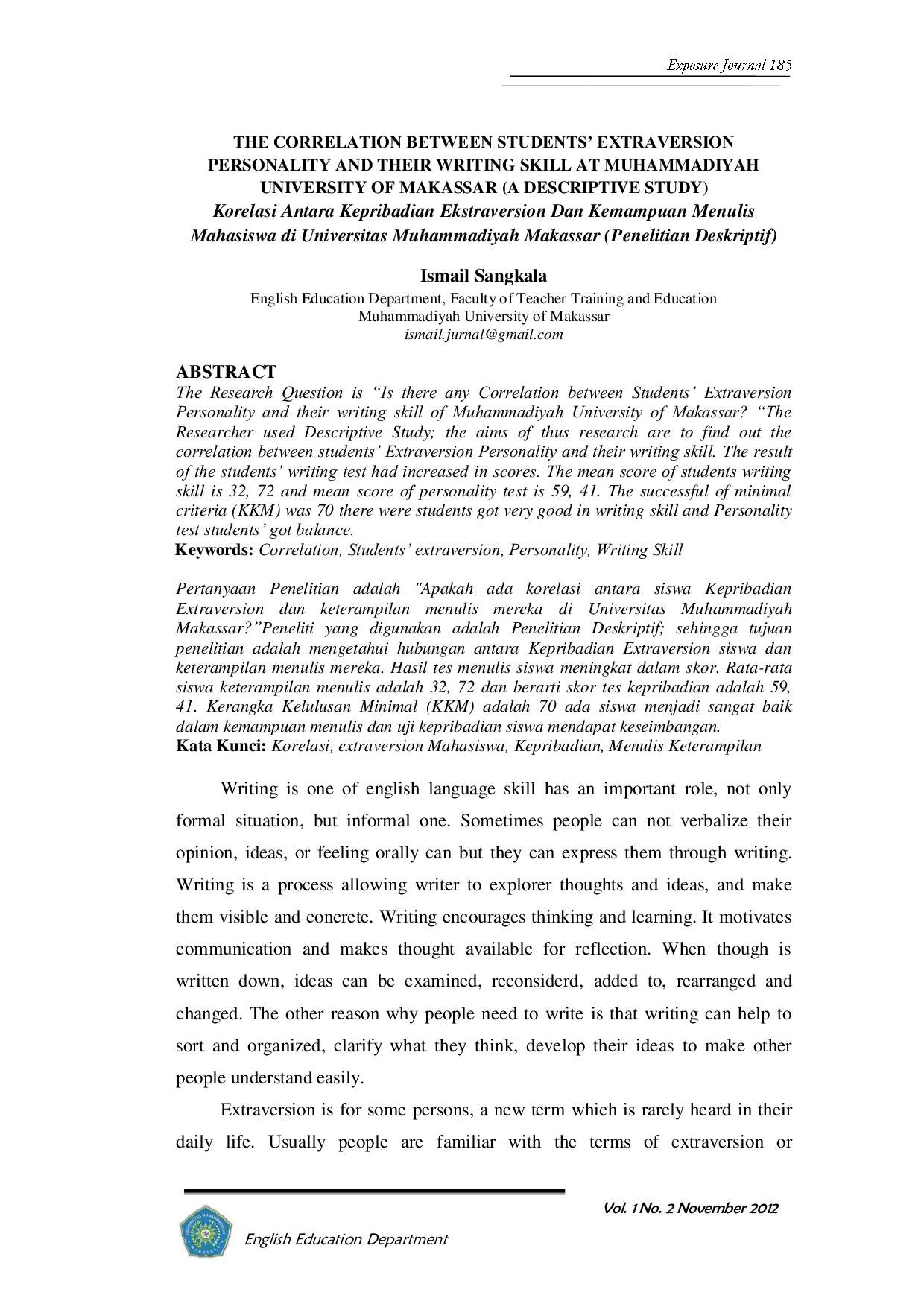 UNISMUHUNISMUH Pertanyaan Penelitian adalah Apakah ada korelasi antara siswa Kepribadian Extraversion dan keterampilan menulis mereka di Universitas Muhammadiyah Makassar.Pertanyaan Penelitian adalah Apakah ada korelasi antara siswa Kepribadian Extraversion dan keterampilan menulis mereka di Universitas Muhammadiyah Makassar.
