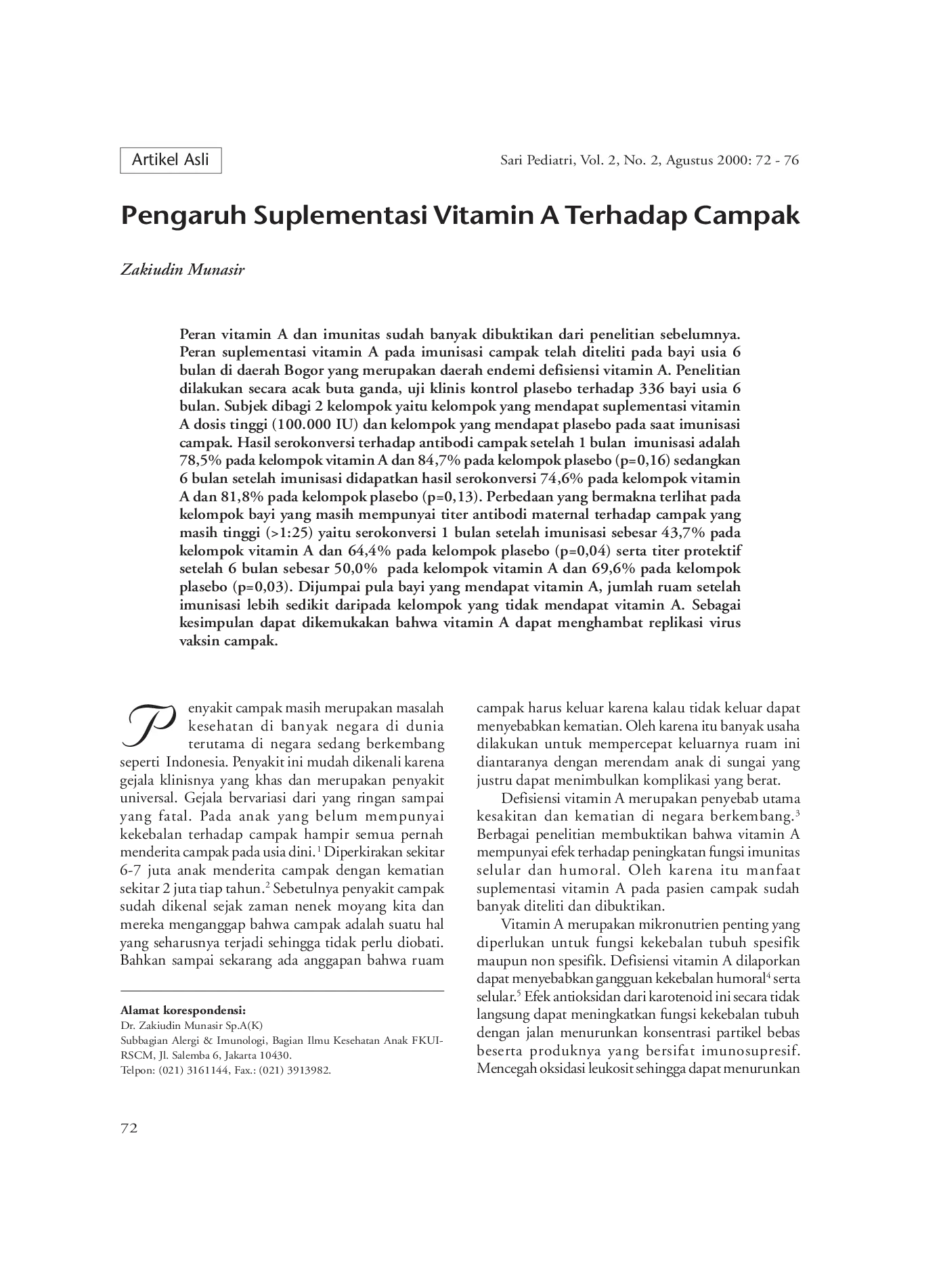 SARIPEDIATRISARIPEDIATRI Suplementasi vitamin A dosis tinggi bermanfaat pada pasien campak, terutama dalam mengurangi gejala ruam. Penelitian ini menunjukkan bahwa vitamin A dapatSuplementasi vitamin A dosis tinggi bermanfaat pada pasien campak, terutama dalam mengurangi gejala ruam. Penelitian ini menunjukkan bahwa vitamin A dapat